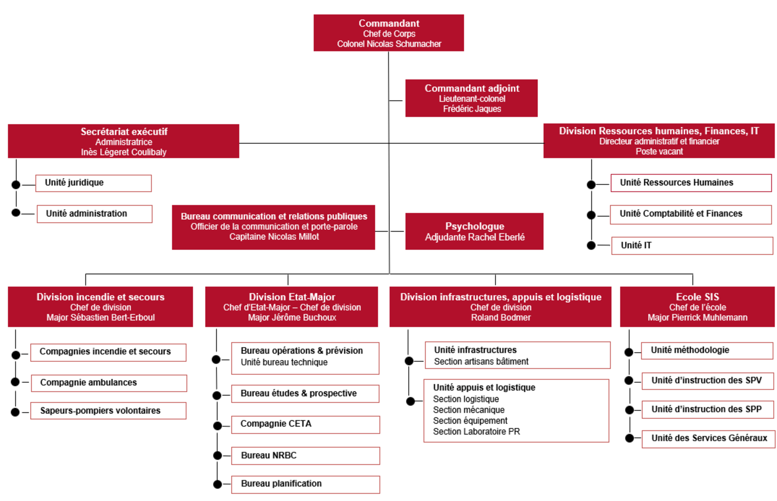 Le Commandant à la tête du SIS coordonne et dirige le service. Les missions d’aide à la population dans le domaine de l’incendie et du secours devant être garanties 24h/24, l’autonomie dans la gestion courante est primordiale.